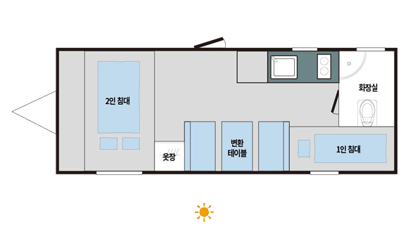 - 인테리어 : 2층침대(2100*900/단열바닥형), 더블침대(2100*1400/매트리스), 변환테이블&침대(2100*1000/매트리스)다기능옷장, 와이드화장실(샤워&변기),TV선반, 멀티형 주방(인조대리석)